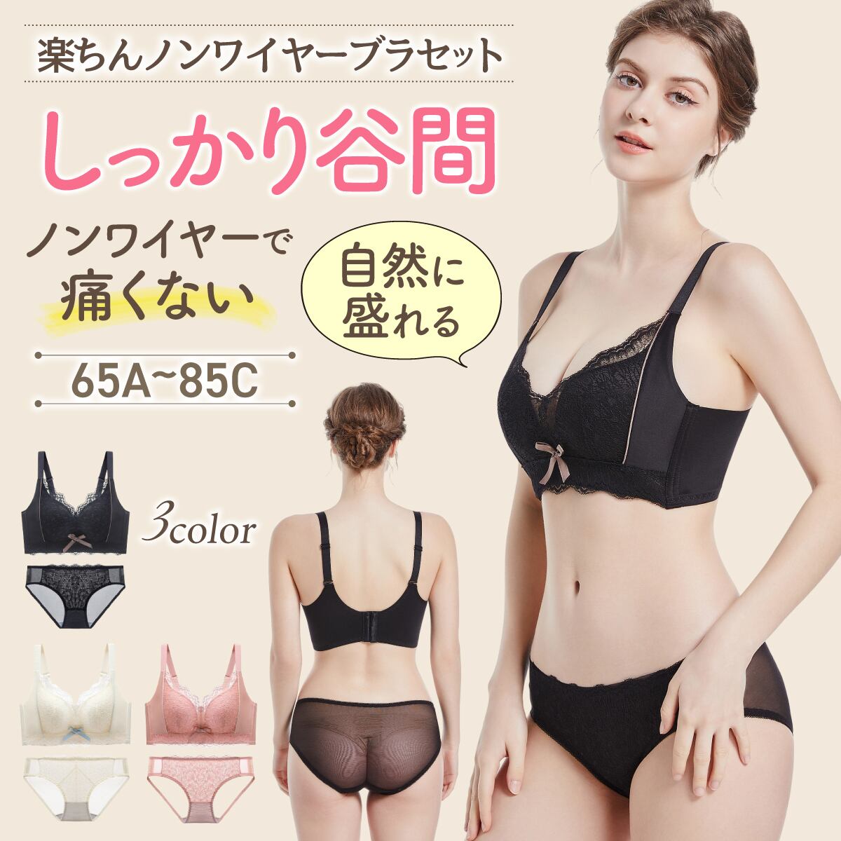 ノンワイヤーで締め付け感がないのにしっかり盛れる美乳ブラ&ショーツセット♪